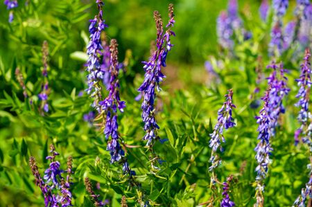 Peas mouse flowers or Vicia cracca or bird, blue or boreal vetch, selective focus, closeup