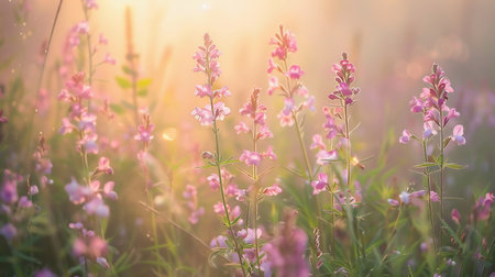 Pastel Flowers in Morning Mist. this tranquil landscape evokes peace and natural beauty, ideal for relaxation.
