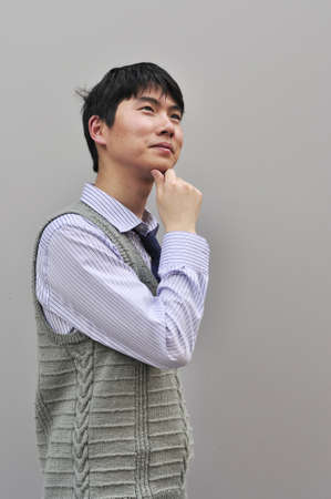 Portrait of young Chinese businessman against gray background