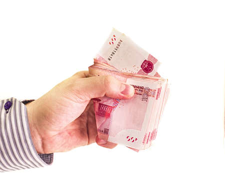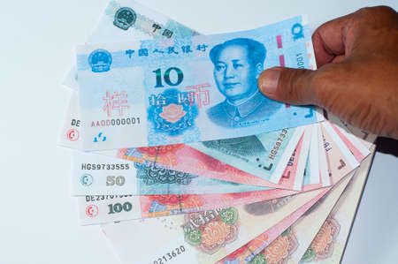 Hand holding Chinese yuan banknotes on white background. Close up human hand giving and paying China money (rmb or renminbi)