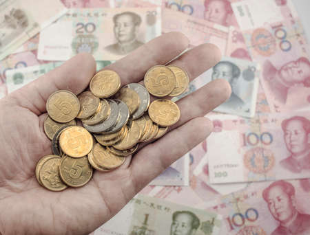 Chinese coins on the hand with bank notes as background