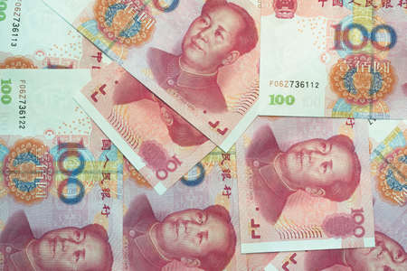 Many of different Chinese yuan banknotes. Chinese paper currency Yuan renminbi banknotes. Money background