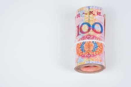 Roll of one hundred chinese yuan banknotes with white robe band isolated on white background.