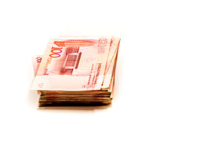 pile of chinese yuan bank notes on white background
