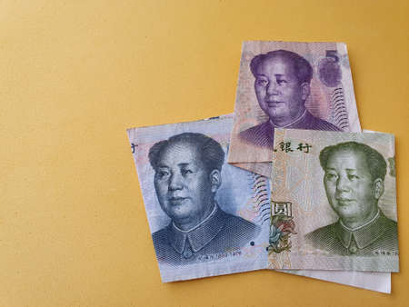 Chinese banknotes of different denominations and yellow background for advertising