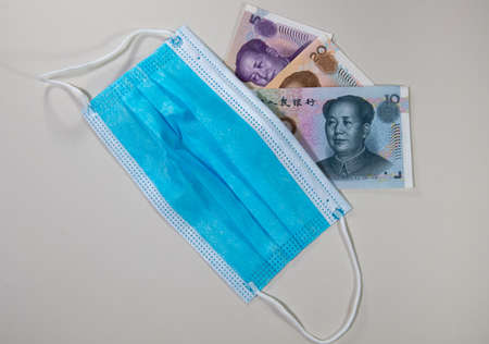 Face masks, the new world currency in 2020. Corona Cov19 crisis makes face mask to the most wanted equipment. Prices rising up. Mouth mask with Chinese renminbi or yuan money on a white background.