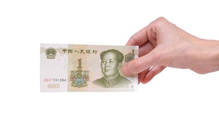 Female hand holding a 1 Chinese Yuan banknote isolated on a white background. Denomination of 1 Yuan.