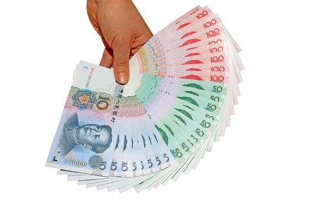 pile of chinese yuan bank note in a hand on white background