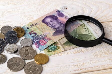 Magnifier on chinese yuan banknotes and coins on a white wooden surface. Check the authenticity of money. Wealth, poverty and counterfeiting money concept. Front view.