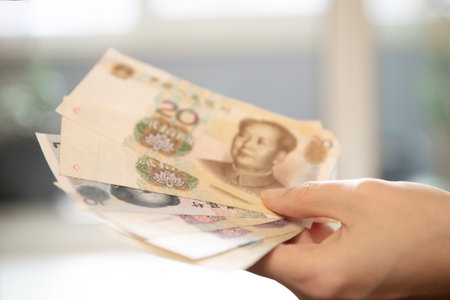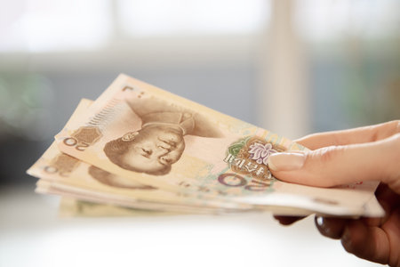 Woman hand holding Chinese yuan banknotes, showing money and financial concept. Currency exchange and personal finance theme.