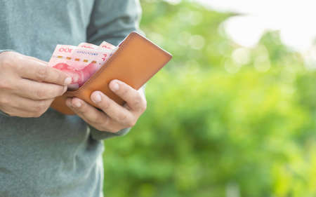 Asian man counting and checking Chinese banknote in his wallet. Outdoor shooting with green blur background