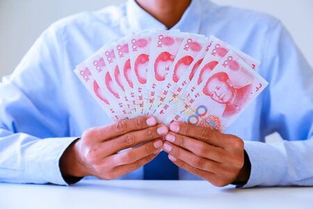 A man holding Yuan notes from China's currency. Chinese banknotes.