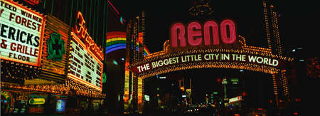 Reno is known as the biggest little city in the world. It shows neon glowing at night from the large signs.