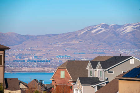 Housing estate on the shore of Utah lake with a view past rooftops to the lake and mountains beyond
