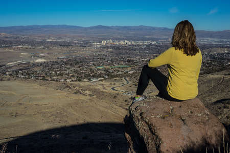 Woman Hiker sitting on boulder overlooking Reno Nevada on a sunny day