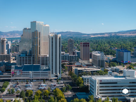 Aerial View of Reno, Nevada with Skyscrapers and Sierra Nevada