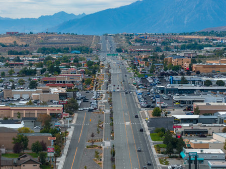 Aerial View of Carson City Road with Commercial Buildings and Mountains