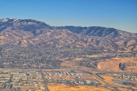 Rocky Mountains, Oquirrh range aerial views, Wasatch Front Rock from airplane. South Jordan, West Valley, Magna and Herriman, by the Great Salt Lake Utah. United States of America. USA.