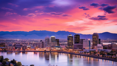 A vibrant city skyline glows with artificial lights against a twilight sky painted with hues of orange and blue. Tall modern buildings and skyscrapers form the urban core, situated alongside a winding river that reflects the city's illumination. In the background, mountains are dusted with snow, their peaks catching the last rays of the setting sun. The surrounding hills are dotted with evergreen trees, adding a touch of nature to the urban panorama. The scene captures a serene yet lively...
