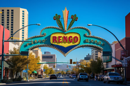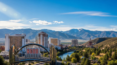 The vibrant city of Reno, Nevada, is showcased with its distinctive skyline, dominated by modern high-rise buildings and casinos. In the foreground, the iconic Reno Arch with its neon sign proclaims The Biggest Little City in the Behind the urban landscape, the Sierra Nevada mountains rise, their peaks dusted with snow, under a clear blue sky dotted with fluffy white clouds. A river flows through the city, bordered by lush green trees, suggesting a pleasant climate. The captures the...