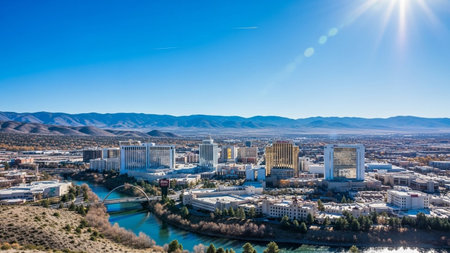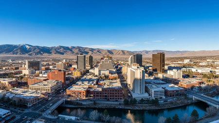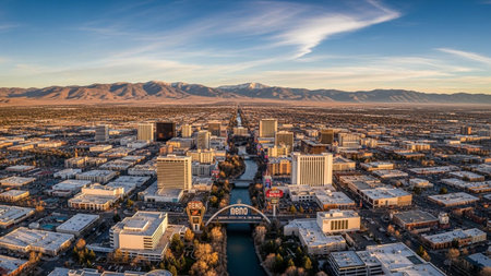 An expansive aerial view showcases the vibrant cityscape of Reno, Nevada, bisected by the winding Truckee River. Modern buildings and urban infrastructure dominate the foreground, with a prominent bridge spanning the waterway. Beyond the city, the rugged peaks of the Sierra Nevada mountains form a backdrop under a clear blue sky with scattered clouds. The captures the dynamic interplay between urban development and the natural landscape, offering a comprehensive perspective of the city and...