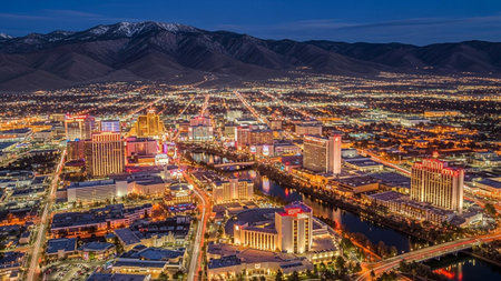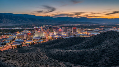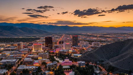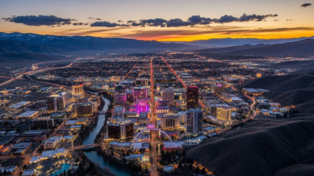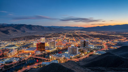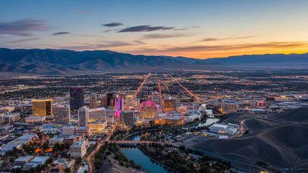 An expansive panoramic view of the Reno, Nevada cityscape unfolds at twilight. The city's skyline is illuminated by thousands of lights from modern buildings and skyscrapers, creating a warm, vibrant glow against the darkening sky. Roads and highways weave through the urban sprawl, with car lights creating streaks of orange and red. A river flows through the city, its water reflecting the city lights. In the distance, rolling hills and mountains frame the urban landscape, hinting at the...