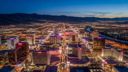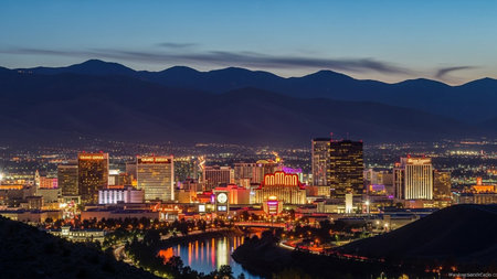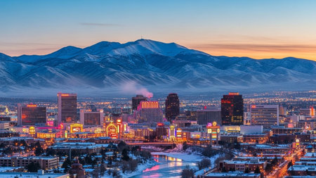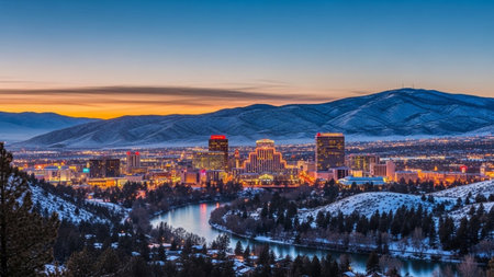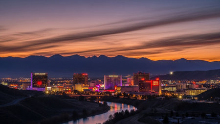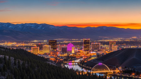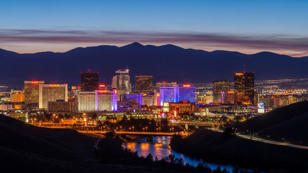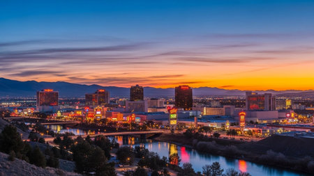The vibrant cityscape of Reno, Nevada, is illuminated against the darkening twilight sky. Numerous buildings, including casinos and hotels, glow with colorful lights, creating a lively urban landscape. Mountains form a dark silhouette in the background. A river winds through the city, reflecting the bright lights of the downtown area. The scene captures the energy and dynamism of the city at dusk.