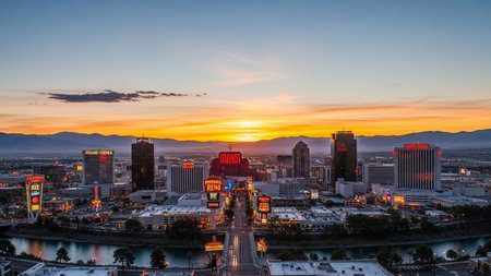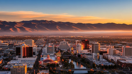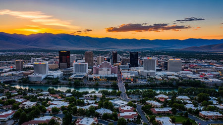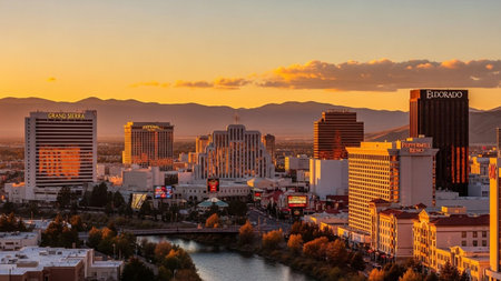 The vibrant city skyline of Reno, Nevada, is captured at sunset, bathed in the warm, golden light of the setting sun. Numerous hotels and casinos, including the Grand Sierra and Eldorado, stand tall, their lights beginning to glow against the orange and pink sky. A river flows through the foreground, lined with trees displaying autumn colors. In the distance, mountains form a natural backdrop to the bustling urban landscape. The scene combines the energy of a metropolitan area with the...