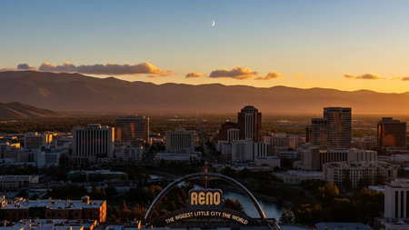 The Reno, Nevada cityscape is captured during a warm sunset, with the sky transitioning through soft hues of orange and yellow. Modern buildings and skyscrapers form the urban skyline, interspersed with smaller structures and a winding river. In the distance, rolling mountains provide a natural backdrop to the bustling city. The iconic Reno archway, illuminated by the fading light, stands prominently in the foreground. offers a serene, expansive view of the city at the end of the day.