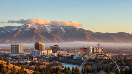 The Reno, Nevada skyline is illuminated by the warm golden light of sunrise, with snow-capped mountains forming a backdrop. A gentle mist hovers in the valley, partially obscuring the lower parts of the city. The iconic Reno arch sign stands prominently, welcoming visitors. Modern buildings and skyscrapers rise above the surrounding landscape, creating a striking contrast between urban development and the natural beauty of the arid mountain environment.