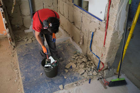 Builder destroying a mirror with a hammer over a trash can. House renovation.