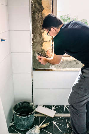 Young man installing wall tile at home. Proffesional tiler laying tiles on a bathroom wall. DIY, Do it yourself concept. House improvement. Repair renovation work. Selective focus, copy space