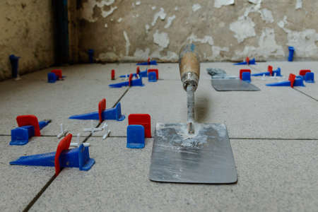 Tile leveling system with plastic wedges. Installation of floor tiles. Ceramic tiles and tools.