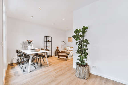 Contemporary minimalist style interior design of light studio apartment with wooden table and chairs in dining zone between open kitchen and living room with white walls and parquet floor