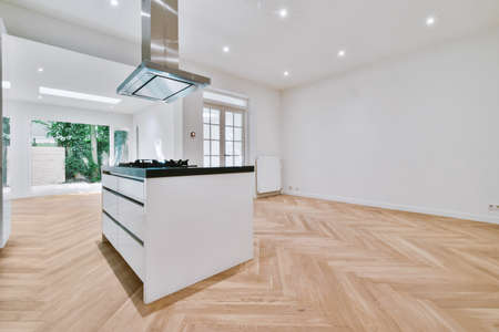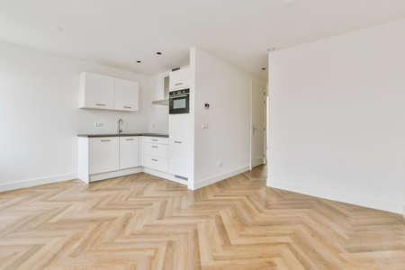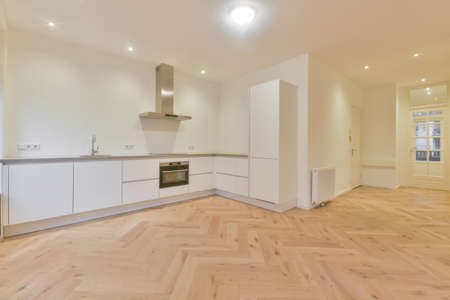 Corner of modern kitchen with white walls, wooden floor and white cabinets