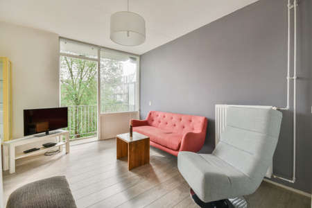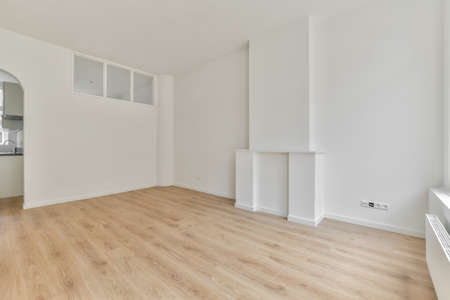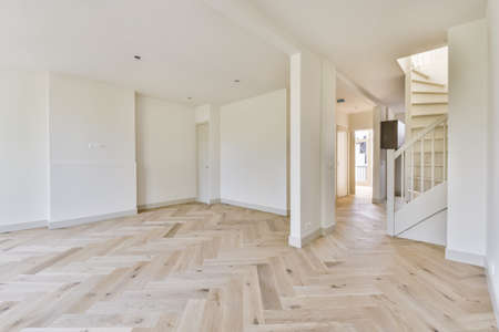 interior of modern bright living room with white walls, wooden floor and comfortable sofa