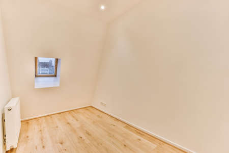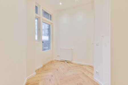 The interior of a small empty room in white with a parquet floor and three internal windows