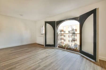 Interior of empty white room with large balcony windows with curtains and wooden parquet floor
