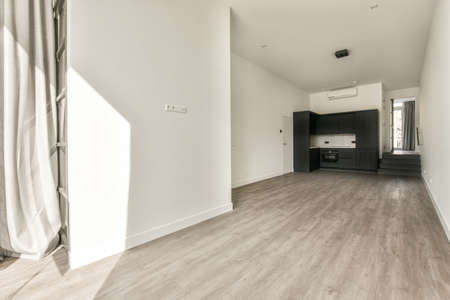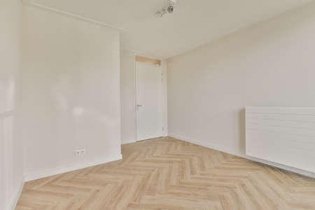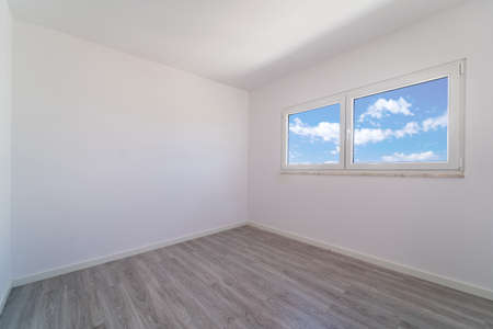 Empty room with gray wooden floating, laminate flooring. House interior, wide bedroom or living room space. New home, apartment or house. Wood floor. Real state and property management