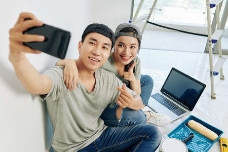Cheerful young Asian couple photographing on smartphone when starting renovation process in their new apartment