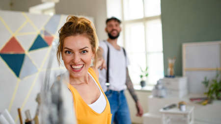 Couple having fun when painting wall indoors at home, relocation and diy concept.