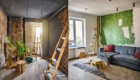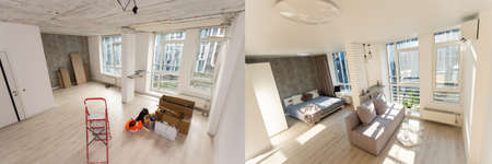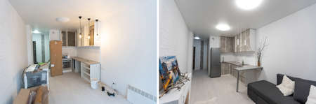 Experience the dramatic transformation of an apartment through a stunning renovation concept. This visual contrasts the before and after states, featuring expert restoration, modern