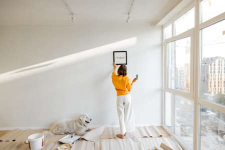 Young woman hanging picture frame in room, decorating her newly renovated apartment, stands with her dog in white room