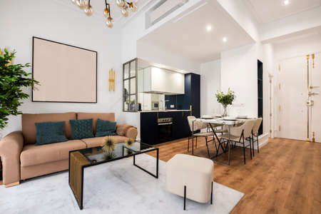 Table with chairs and flowers located near lounge area and kitchen in spacious room of contemporary apartment