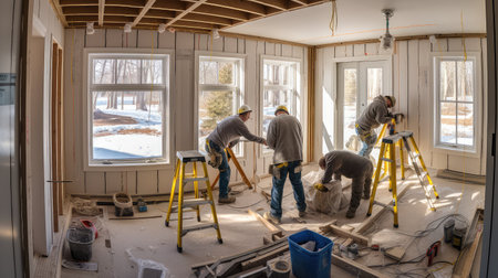 Construction workers renovating apartment hallway with tools and materials under natural light
