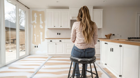 Interior designer reviews newly painted accent colors in a spacious kitchen renovation project.