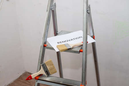 text renovation, black letters on white paper. home improvement, dirty paint ladder, roller, brush and tray.repairing room.Stepladder and different tools in room. Interior renovation
