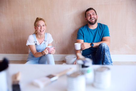Portrait Of Couple Renovating Kitchen At Home Take A Break From Decorating Kitchen