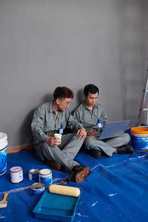 Back view of professional interior renovation team working on home improvement project