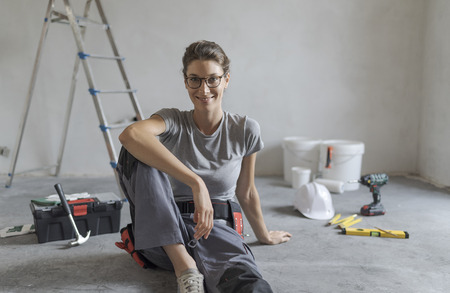 Attractive smiling woman renovating her house, she is sitting on the floor with tools and posing, home makeover concept